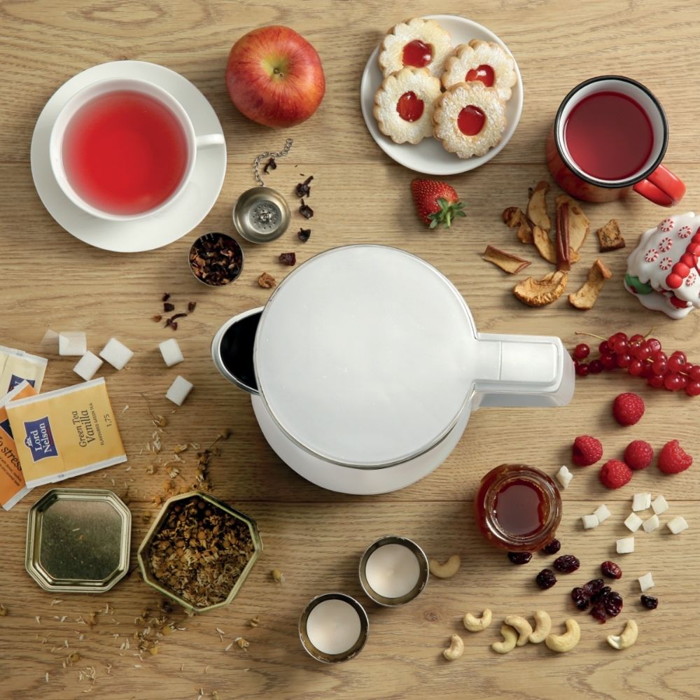 Чајникот е поставен на основа со 360° вртење за слободно поставување во кујната, со основа која ја скрива долгата кабелна линија и ја прави употребата поубаво уредена.