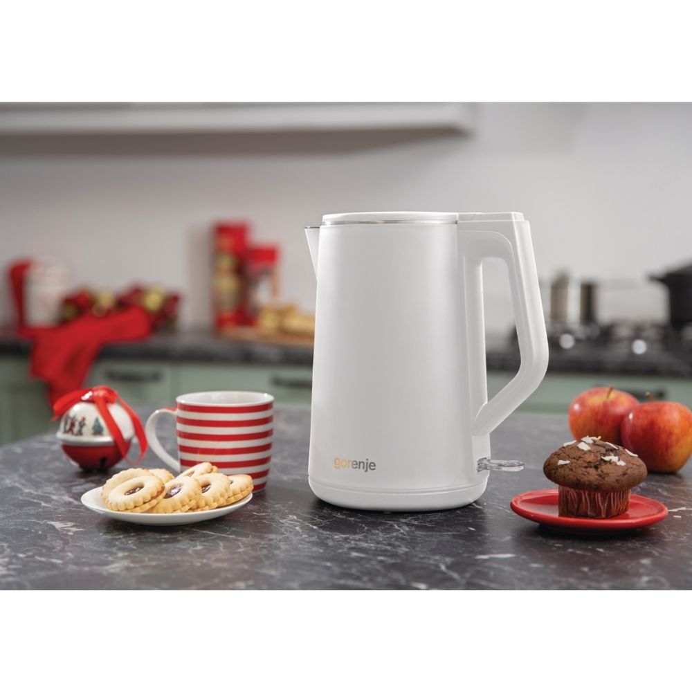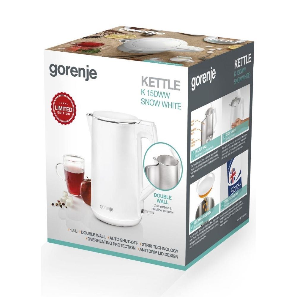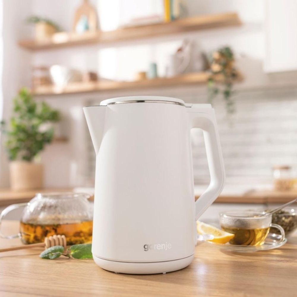 Овој електричен чајник спојува стил, безбедност и практичност за вашата кујна. Системот со „double wall“ (двојни ѕидови) и воздушен слој меѓу внатрешниот и надворешниот слој гарантира ладен надворешен дел и потешко загревање на рачките — што значи: додајте топол напиток без грижа за печење на прсти.